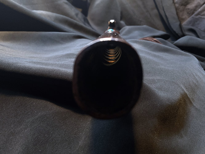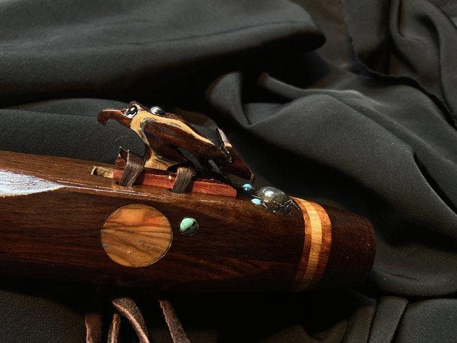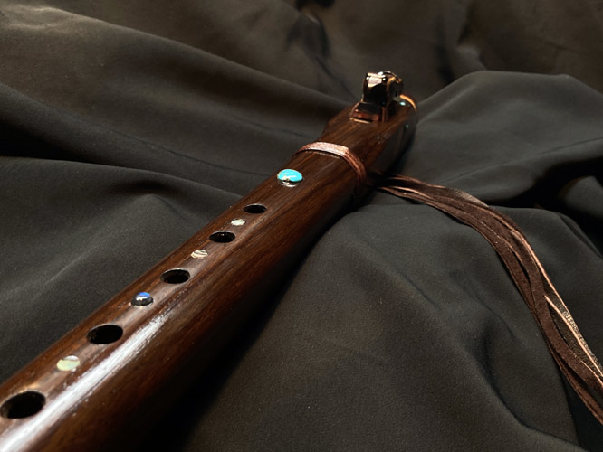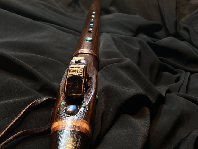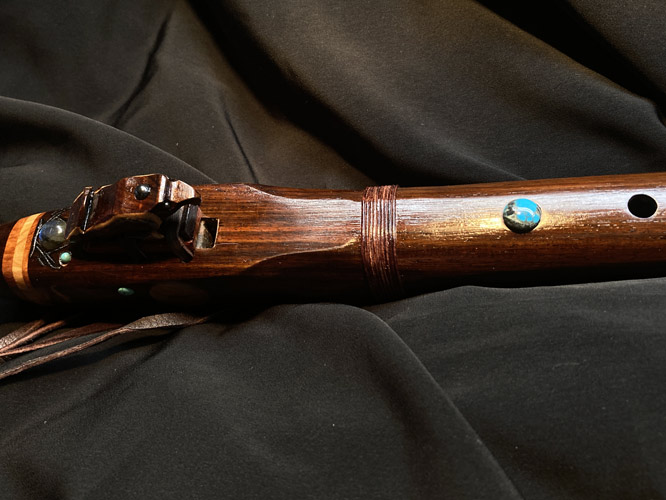 Laotian flamewood is one of the hardest, most beautiful, and nastiest of the rosewood species on the planet. There are aspects of this build that look like they were done by a six year old, owing to the obstinance of the material. I have one chunk of wood left of this stuff, after which I’ll say adios to working with it again. Ever. Tuned to D#, this oval bore flute is 22-1/4” in length. Contrasting woods include amboyna burl and Bethlehem olive, while inlay material is predominately turquoise and labradorite, with a little abalone and hematite thrown in. As we continue to run around under the cloud of Covid, please remain cautious. Extra cautious if like myself, you got a J&J vaccine. It appears the newest variant (Lambda) just laughs at this vaccine…..probably uses it for food. Stay safe and play nice.