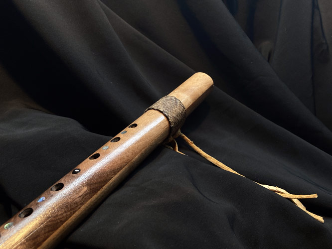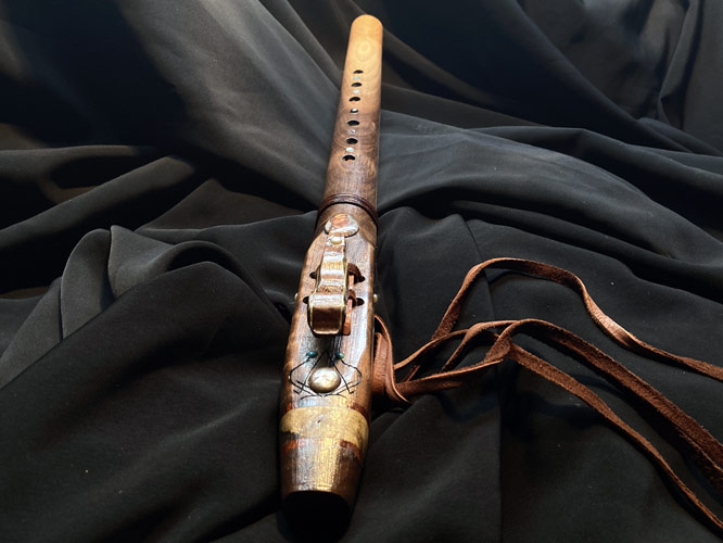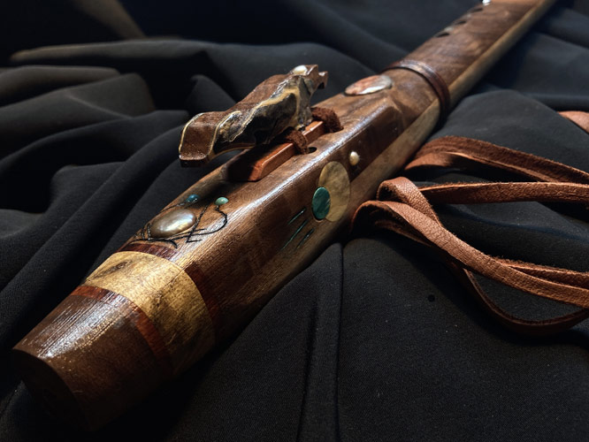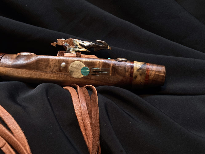This Virginia walnut Gm flute is my last instrument for the year, and it’s a 20 inch screamer. Woods in addition to the walnut include California buck eye burl, box elder burl, SE Asian amboyna burl, mappa burl, and Oklahoma red cedar. Additional condiments include Mexican crazy lace agate, turquoise dots, Sleeping Beauty Mine powdered turquoise, orange pearls, a coin pearl, abalone and hematite. Also includes a permanent rawhide binding and a removable South Dakota prairie rattlesnake wrap. And yes, the fetish block is another bird carving. There is just very little artistic license you can express carving a porcupine or gopher…………….On another note, I sold a flute last week, which generated an unsolicited testimonial on Dec. 10th. I have over 100 posted on my website, but I have never shared them outside of that platform,,,,until today. This was a truly humbling surprise. The client wrote “ If you’re on the fence or deciding between one of Rich’s flutes and another craftsman’s, let me cast the final vote for you: buy from Rich. I got the chills blowing in to this for the first time—it’s exactly the sound for which I’ve been looking. The attention to detail, craftsmanship, right down to the carefully curated paperwork he sends, this flute and the whole process have been world class. I really do feel like this isn’t just a flute; I can feel the love Rich poured into this, and look forward to enjoying it for decades to come.”….He wanted to add more, but I suggested to do so, would appear that I created the whole thing myself. Here’s hoping 2022 recovers gracefully from 2021and 2020. Play nice, and be safe.