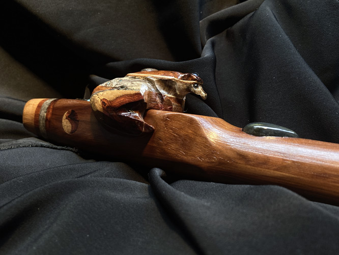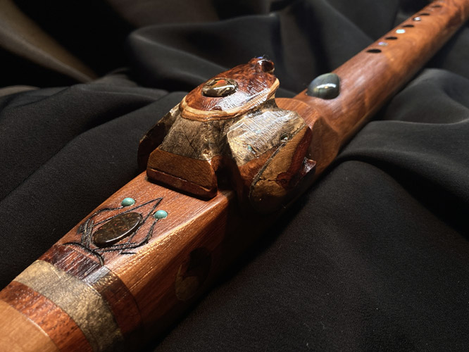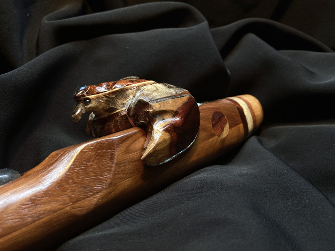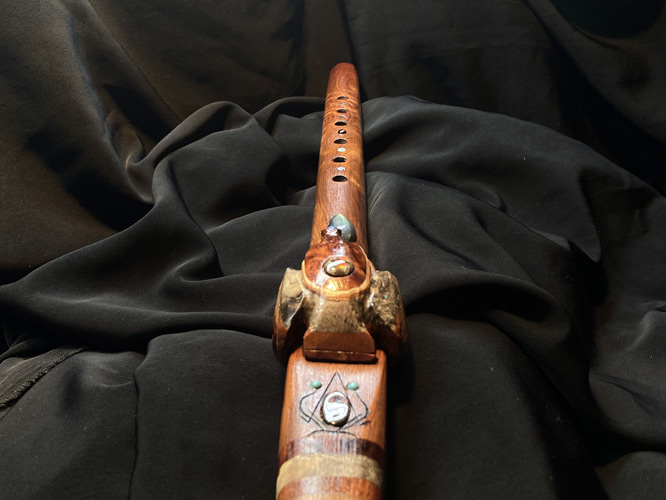 So I mentioned back in January I had no more blanks for building flutes, so I was taking a vacation to start noodling with my steel guitars. Ms. Denise won’t let me play them in the house because I’m horrible at it, and playing them in my unheated flute shop, at 52° F turned out to be way less than fun. Rooting around, I found I had two instruments already ripped and routed, and don’t want to touch either. One is Laotian flamewood (VERY hard) and the other is Lignam Vitae…the hardest wood on the planet. This crap is so hard and oily, it’s used as self lubricating bearings in submarine engines. Then I found I had ONE blank left of New Zealand 50,000 year old kauri bogwood…so for the last 7 weeks I’ve been building a flute. Most of that time was spent in building the compression fit bird. It simply slides on and off. I’ve built them before, and they mostly look like turtles. This one doesn’t look so much like a turtle, but looks a little like a flying anteater…..I’ll take it.