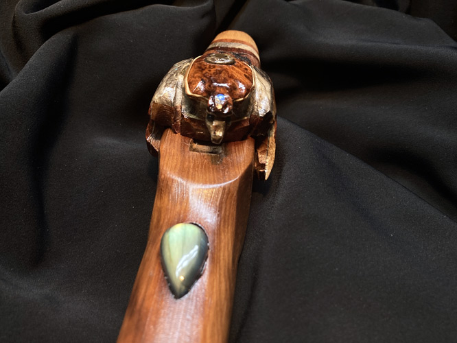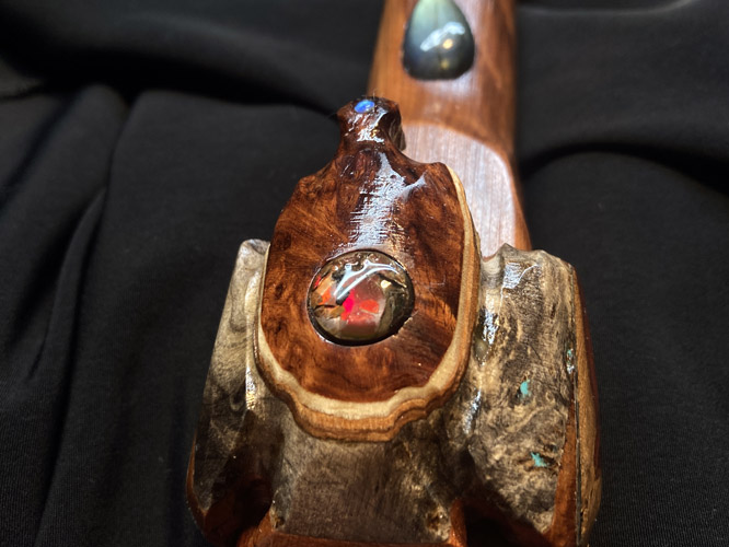 The ingredients include a couple of rare items. In addition to the Kauri, having been preserved in a bog for 50,000 years, and maybe longer, I’ve included two examples of ammolite, which is the occasionally iridescent internal shell structure of the ammonite, a cephalopod like a nautilus. Having lived in the shallows of the sea that extended from Alberta CN to New Mexico, along the Eastern slopes of the Rockies. These critters, as gemstones, are rarer than diamonds. The example at the mouthpiece is “dragonskin” ammolite, and is rarer still. Both are between 70-110 million years old. Other woods include SE Asian amboyna burl, CA buckeye burl, Virginia walnut, yew burl, and mappa burl. The remaining ingredients include almandine garnet, abalone, hematite, turquoise, and Australian fire opal.