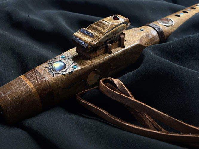 Huangana Negra remains one of my favorite tone woods in building flutes. This started out tuned to F#m, but became a Gm after adding the stylized snake tuning hole at the far end. Amboyna burl, old growth redwood burl, mappa burl, box elder burl, with addl. accents of African garnet, Mexican crazy lace agate, labradorite, Sleeping Beauty mine turquoise, abalone and hematite. and a little rawhide wrap…..Stay Covid cautious, and play nice with one another.