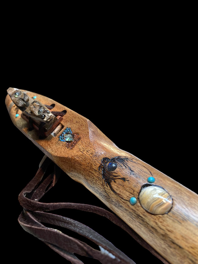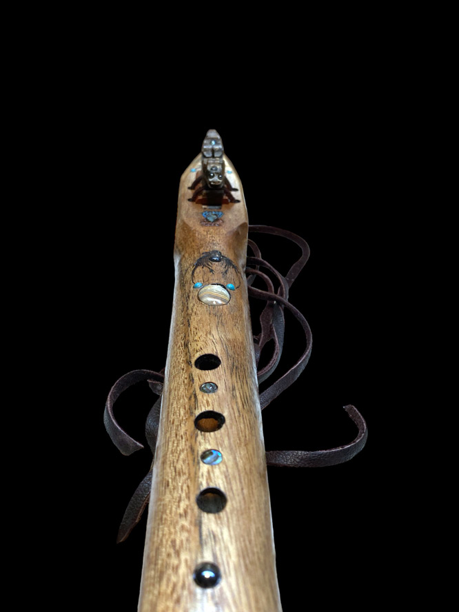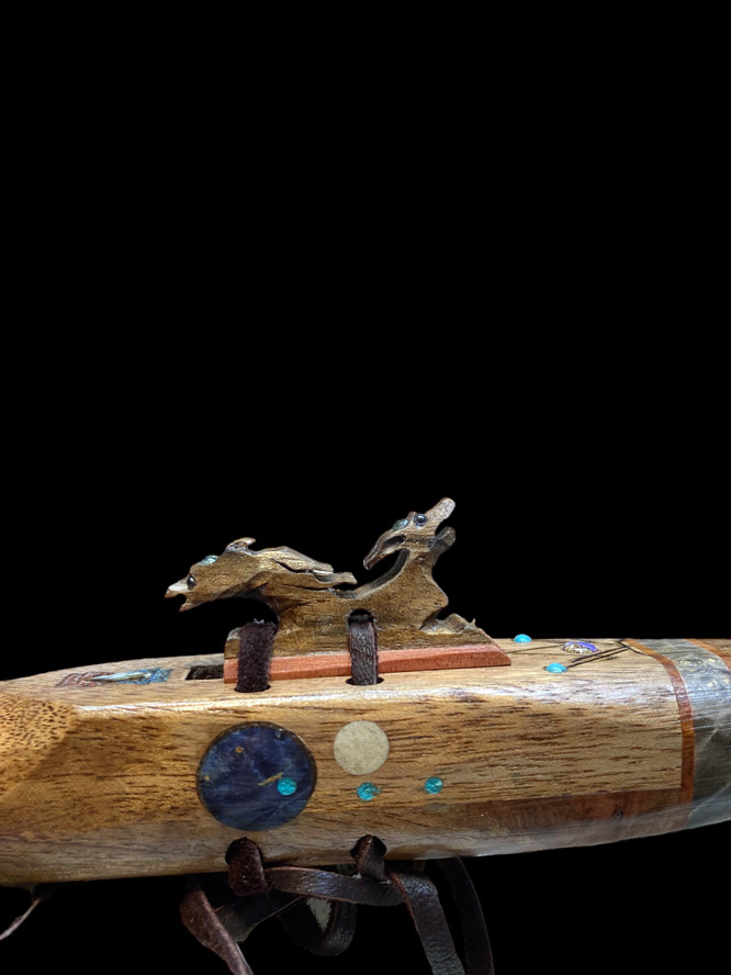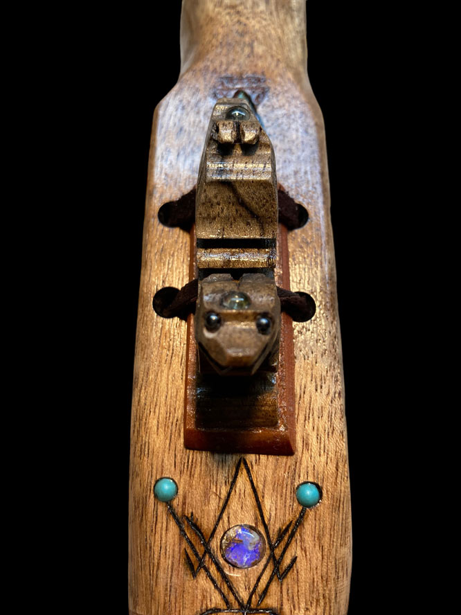 This SE Asian Paldao instrument has quite an array of ingredients, to include amboyna burl, box elder burl, moose antler, pyrographics, abalone, Australian boulder opal, Mexican crazy lace agate, hematite, Maine tourmaline, turquoise, and Sleeping Beauty turquoise powder. It is tuned to 432Hz, in the key of Em. Thankfully, Spring is coming. Play nice.