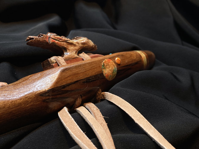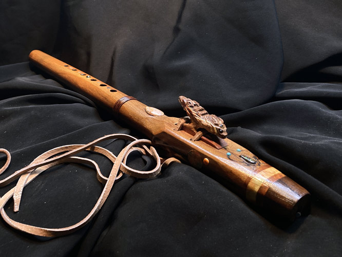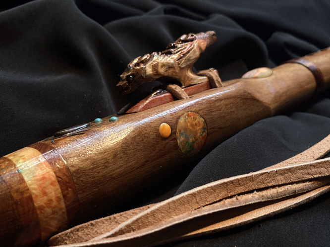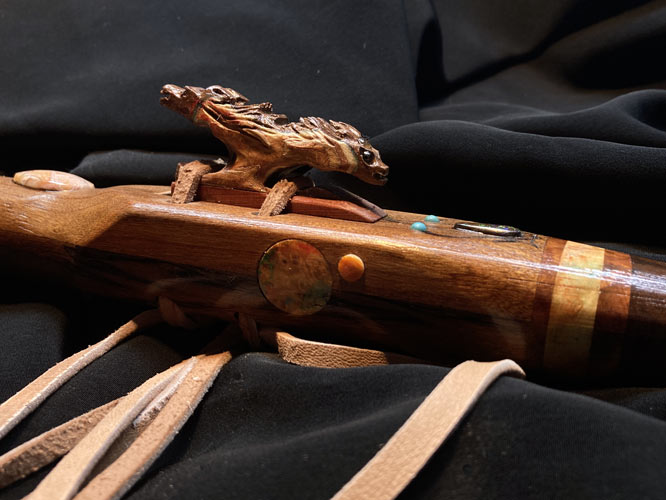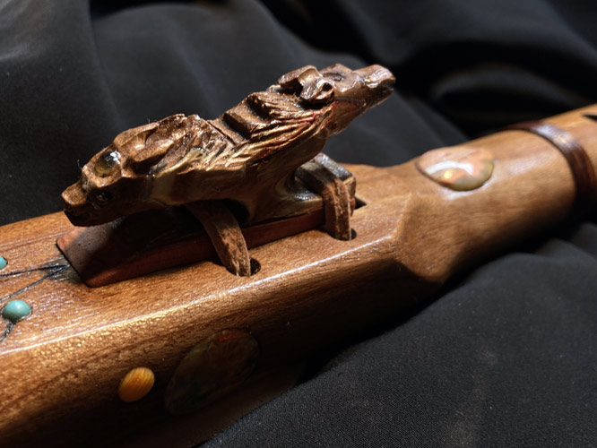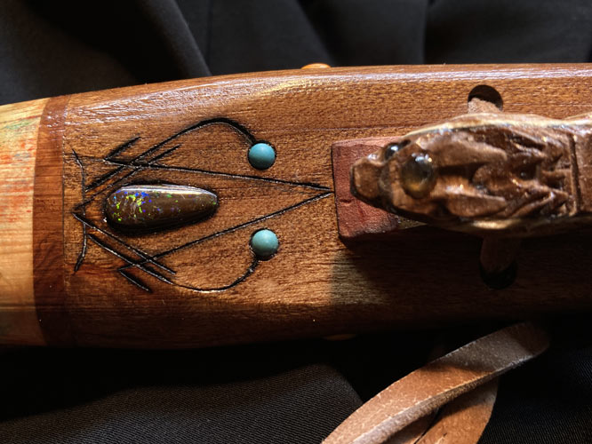 So Peruvian huangana negra is the material used for this G#m instrument, as it remains one of my favorite tone woods, I continue to be the only builder on earth using this material, and it is not the most cooperative in terms of its willingness to become a flute. The fetish block is not a bird. It is a theme I dreamed up years ago, entitled “Fight or Flight” wherein one horse is willing to charge into battle, while the other, head lowered, runs from conflict. It is a perfect example of why I continue to prefer carving birds. Additional materials include Australian boulder opal, Mexican fire opal, Mexican crazy lace agate, spiny oyster, hematite, African garnet, rainbow topaz, turquoise, and abalone. Additional woods include SE Asian thuya burl, box elder burl, yew, mappa burl, quilted maple and Hawaiian koa. I encourage you to visit my website, WWW.Querenciawoodwinds.com to see exact dimensions of these native American style flutes. You will see a detailed accounting of materials, their placement, and be able to listen to a sound file of each posted instrument. Perhaps you will want to make a purchase. I encourage your comments and concerns… Play nice, and continue to play safe.