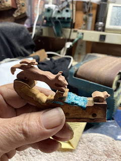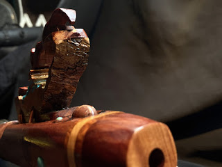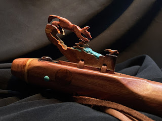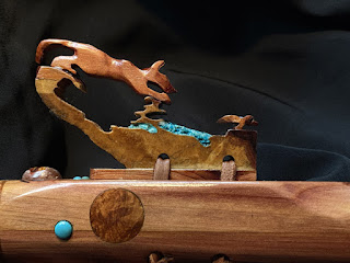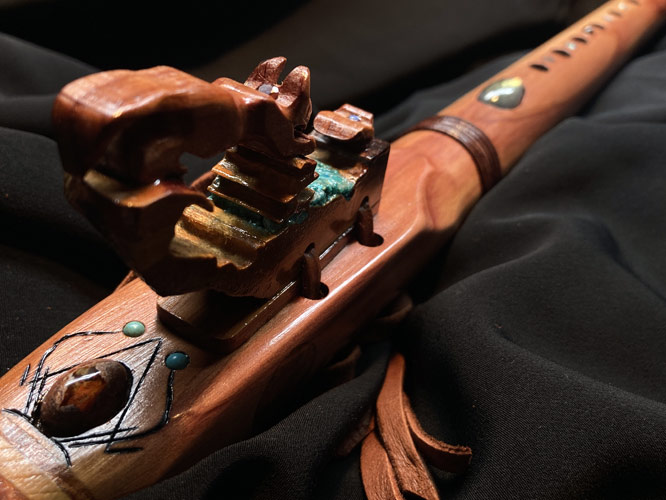 So about 12 years ago, I cut some live edge amboyna Burl, and had a tiny scrap left over. I thought then….maybe I can make something with this someday. I stumbled across it once or twice a year since then. I just finished a flute of Oklahoma red cedar, and used that scrap as part of the block, and it tells a story. The latest flute still has a bird, but in this case, the bird is potential lunch. It also has a cat, stalking the bird. Cats will stalk animals smaller than themselves, even if they’re not hungry. I guess it’s just a fun thing to do. The assemblage was somewhat fragile, so I stabilized it with crushed Arizona turquoise and chrysocolla, and created two birds, and two cats….figuring somebody will eventually break one or both of them. While fooling with it, I set the second bird up on the butt of the cat, and the visual got me laughing so hard I almost pee’d myself…..I’m entertained easily. Anyway, if you find yourself in a bar fight, and your only weapon is this flute, please remove the block before mixing it up. If you are in a bar, and pull out the flute to improvise a little tune,…I guarantee you’ll find yourself in a bar fight. Ingredients include Mexican boulder opal, Mexican fire opal, Australian opal, garnet, faceted African cognac diamonds, abalone, labradorite and turquoise……In the meantime, Covid 19 is making a return engagement where I live, it’s got a new cast of characters and the same deadly plot twists. Get vaccinated and stay Covid cautious.#Nativeamericanstyle #querenciawoodwinds